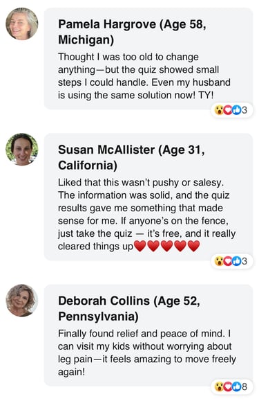 If any of this sounds familiar, I’d encourage you to explore the same quiz I took. It’s quick—less than 1 minute—and it might point you toward the small steps that could make your legs feel lighter and more comfortable.